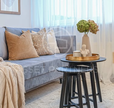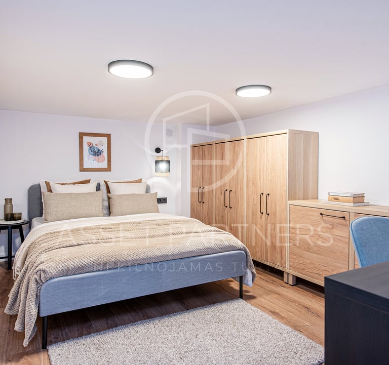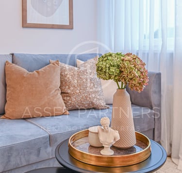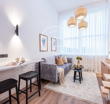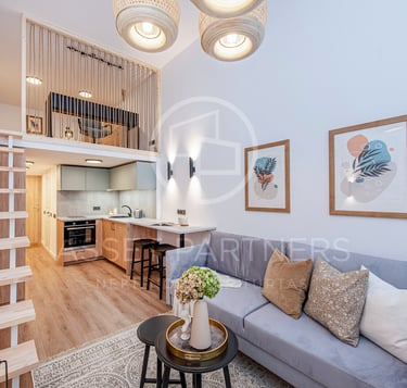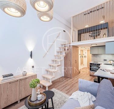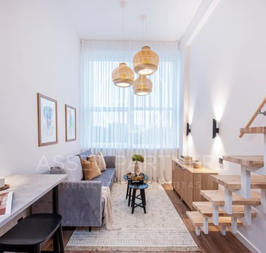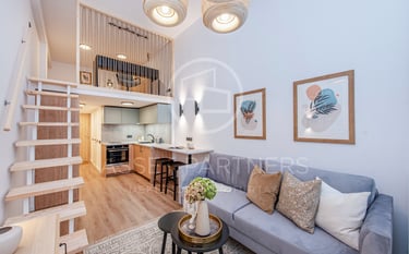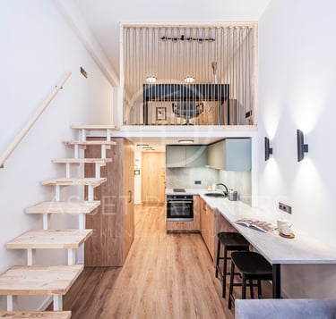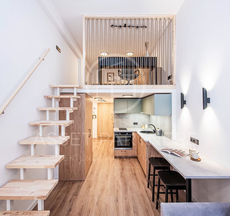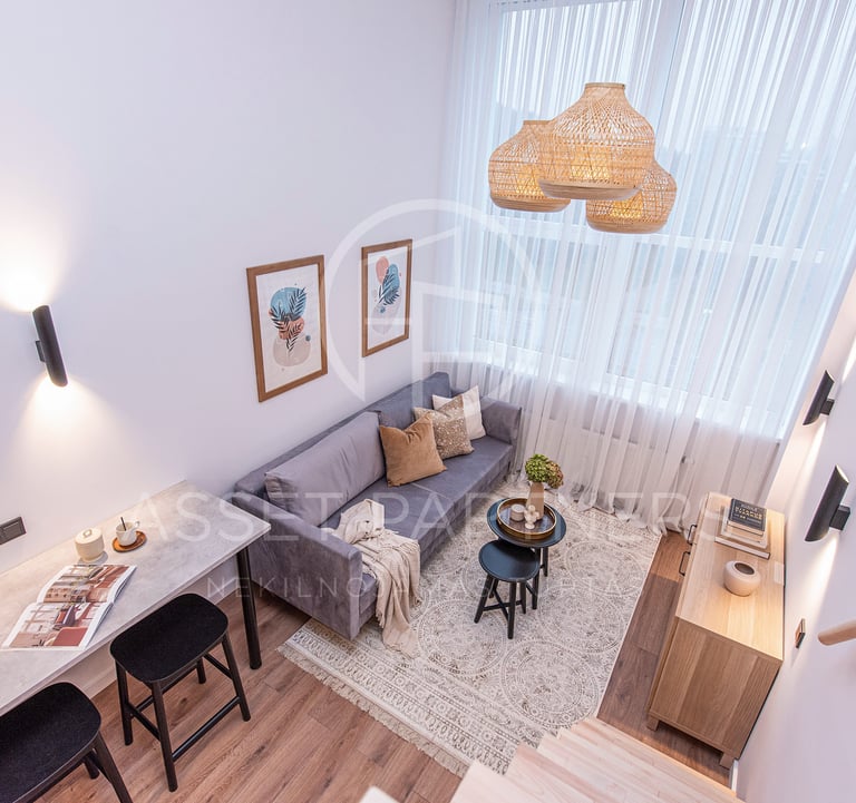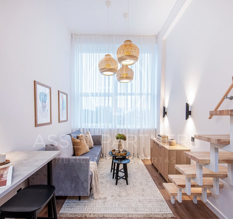 Projektuojant šį 34 m2 loftą vienas didžiausių iššūkių buvo funkcionaliai sutalpinti visas reikiamas zonas: 22 m2 erdvėje turėjo tilpti holas, vonios kambarys, virtuvė, valgomasis ir svetainė, o 12 m2 antresolėje - miegamasis ir darbo vieta. Be to, reikėjo rasti vietą laiptams bei suplanuoti pakankamai vietos drabužių, daiktų pasidėjimui. Visa tai pavyko įgyvendinti, o virtuvėje netgi sukūrėme didelį darbastalį, kuris gali būti naudojamas ir kaip valgomojo stalas.Loftui parinktos šiltos, šviesios plokštės ir audiniai - tokiu būdu optiškai padidinama erdvė ir sukuriama jauki atmosfera. Žaismingumo čia suteikia spalvingi printai, ryškios pagalvėlės bei boho stiliaus šviestuvai.