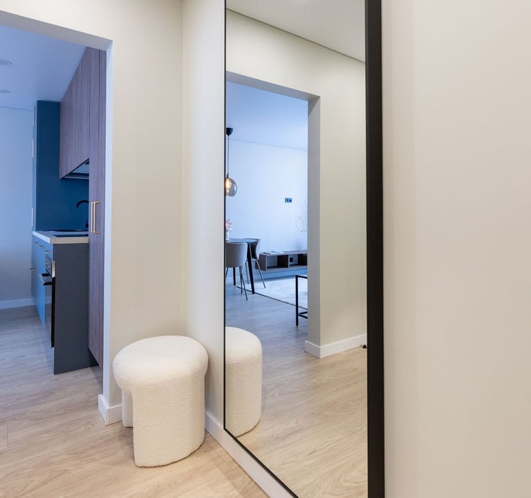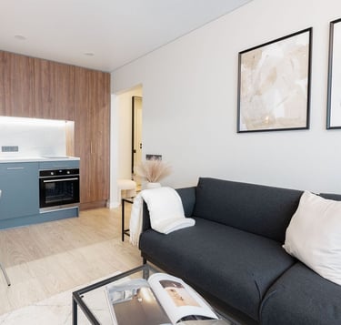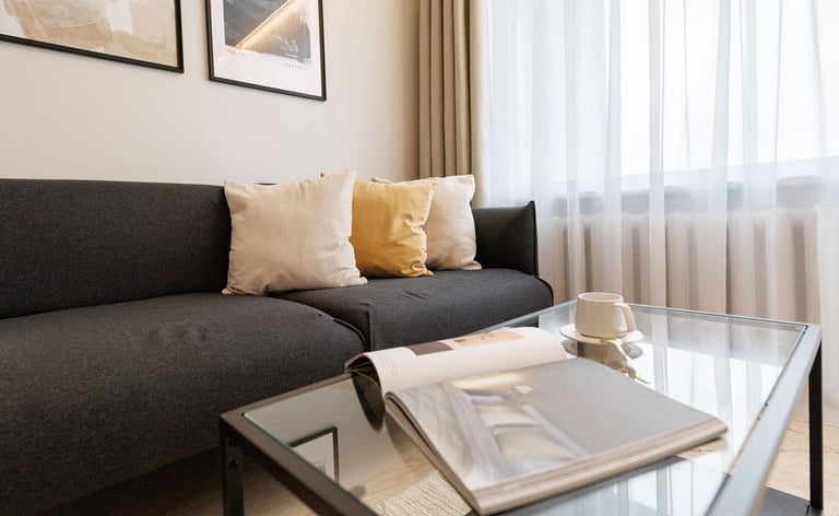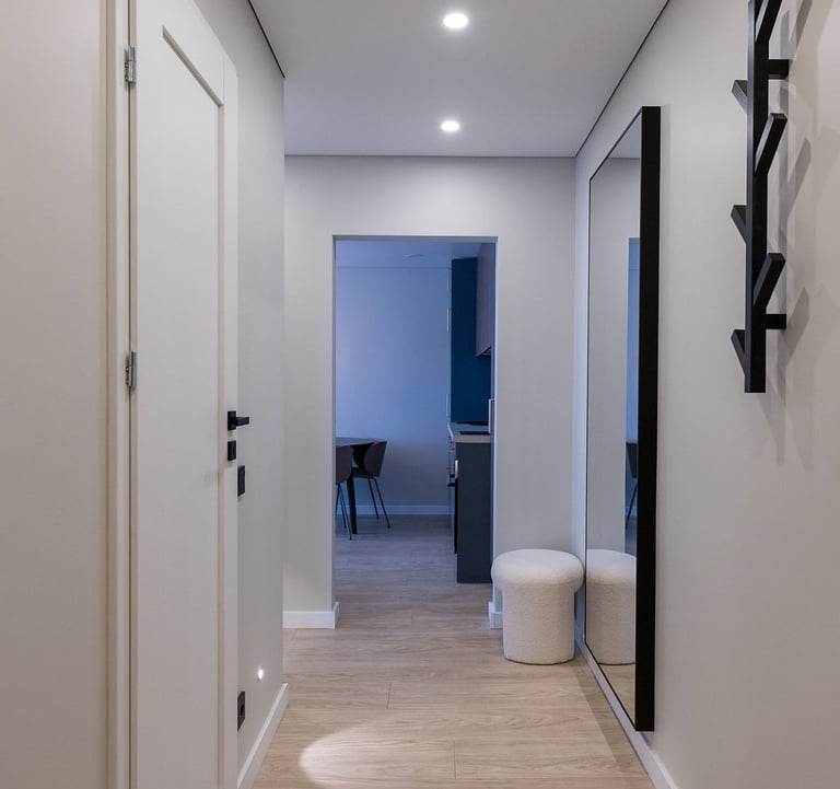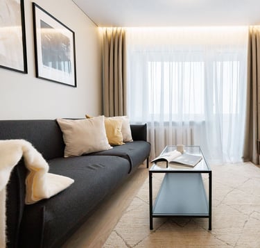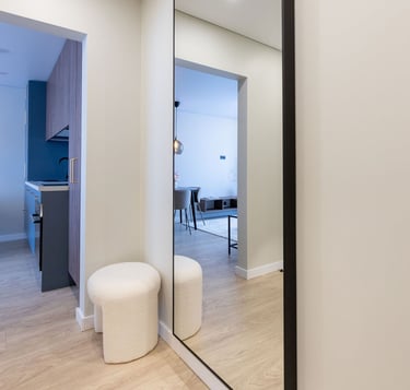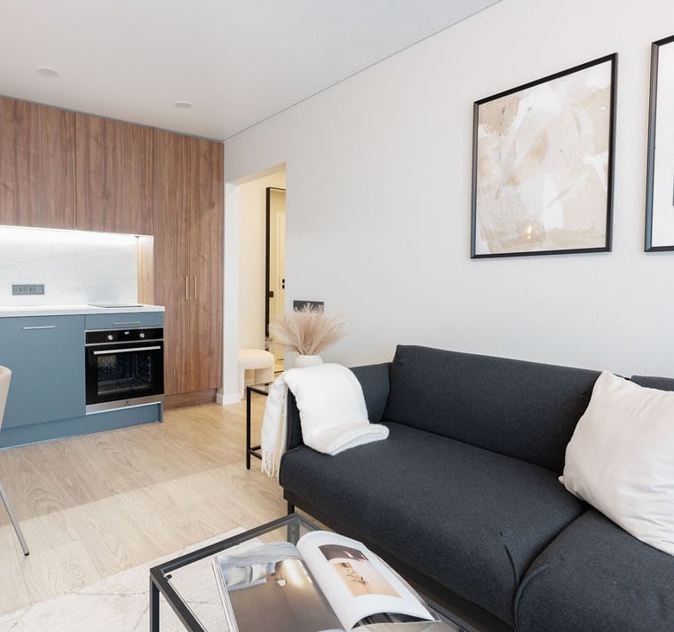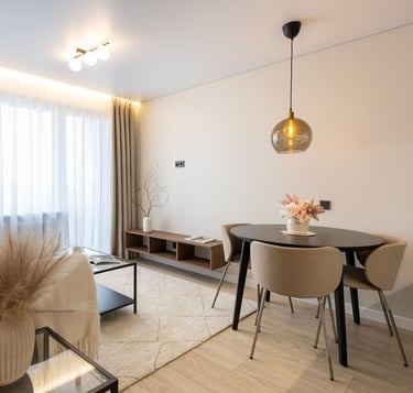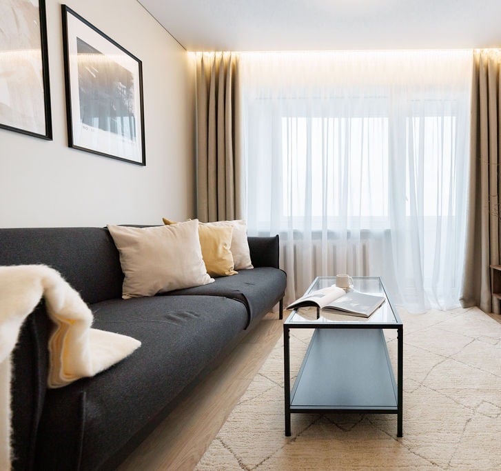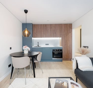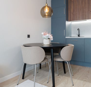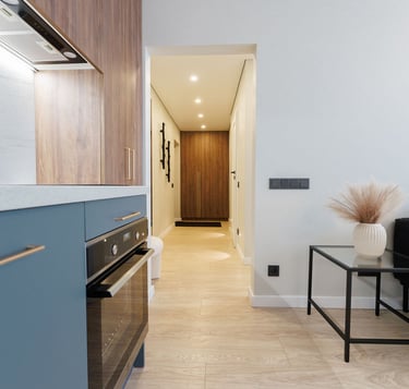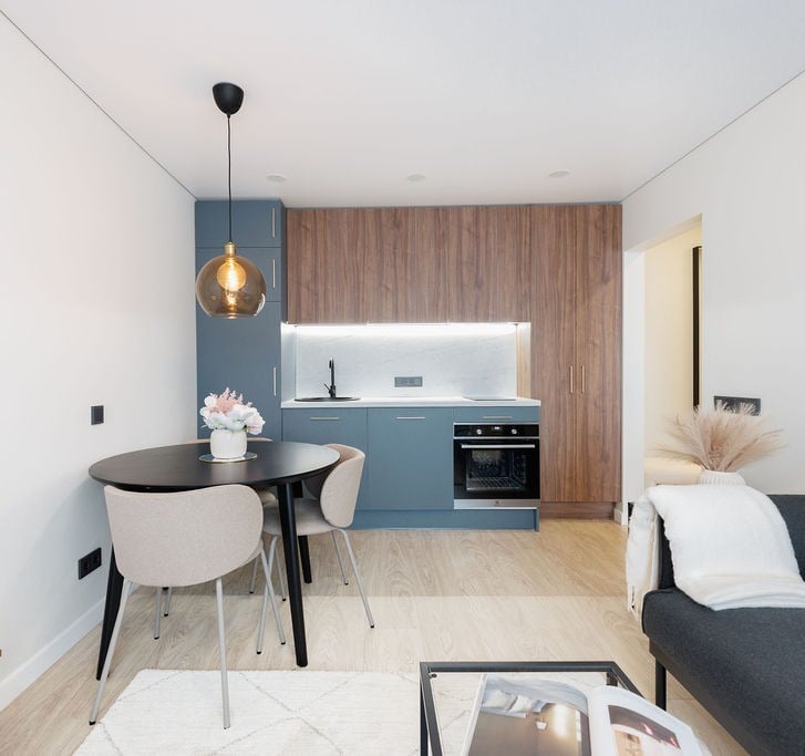 Nenorėjau sukurti įprasto neutralaus interjero, tad virtuvės baldams parinkau prigesintą mėlyną spalvą, tad šie baldai tapo buto akcentu.