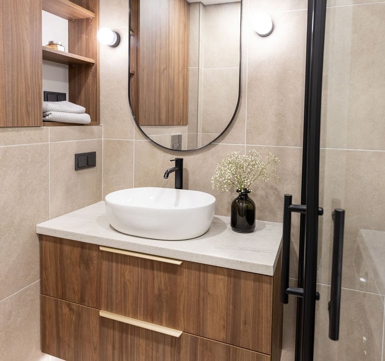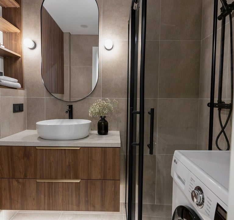 Vonios kambaryje tiek grindims, tiek sienoms naudotos tos pačios plytelės bei medžio rašto plokštė - šį derinį dar papildė juodi akcentai, tad erdvė pavirto itin jaukia.
