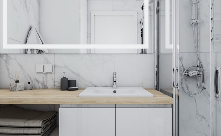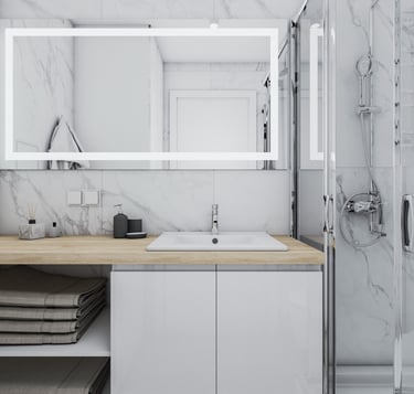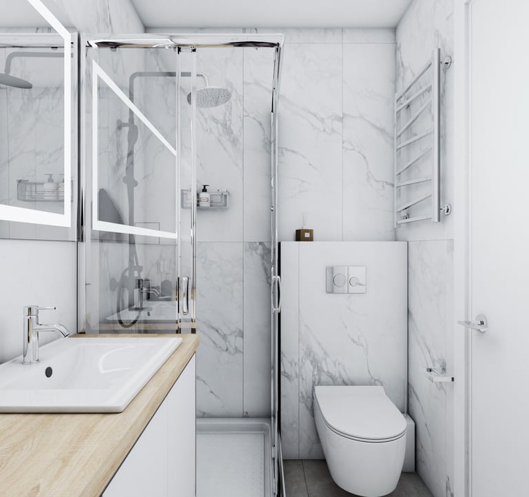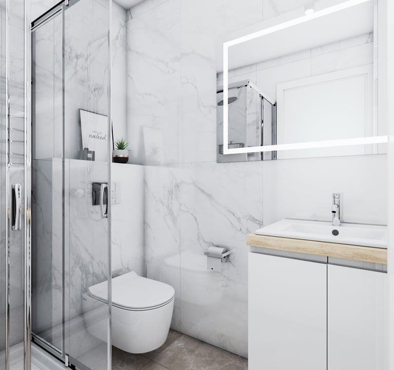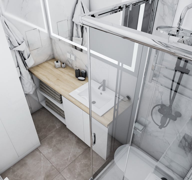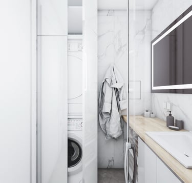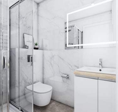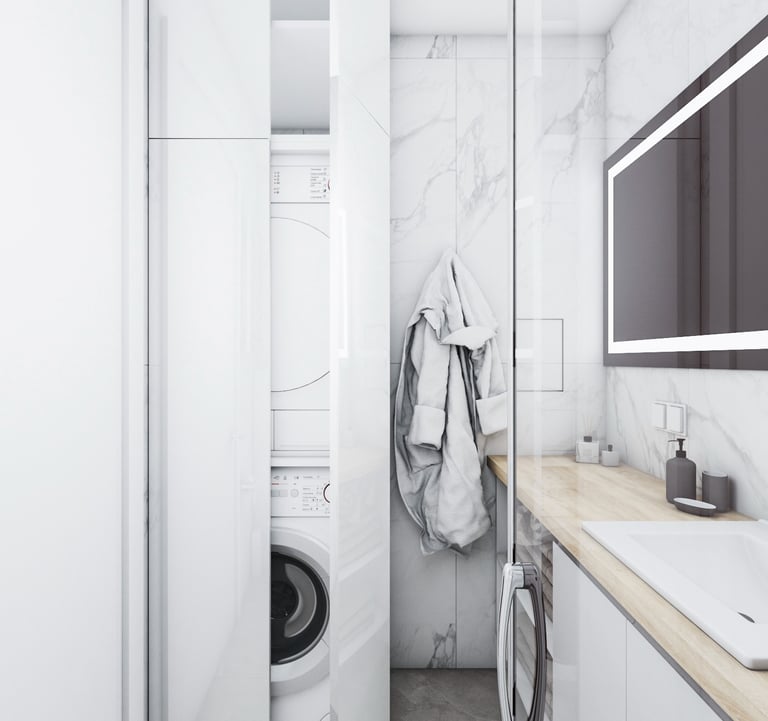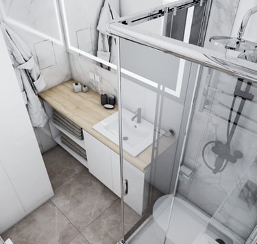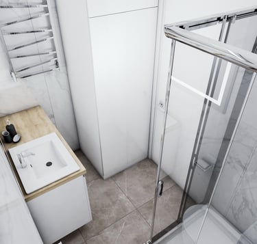Sujungti 1,11 kv.m. WC ir 2 kv.m. vonia. Taip gavosi 3,64 kv.m. vonios erdvė. Nors ši patalpa vis tiek išliko labai nedidelė, man pavyko į ją sutalpinti dušą, unitazą, praustuvą bei skalbyklę su džiovykle. Kad vonia atrodytų erdvesnė, buvo pasirinktos šviesios marmuro/betono imitacijos plytelės.