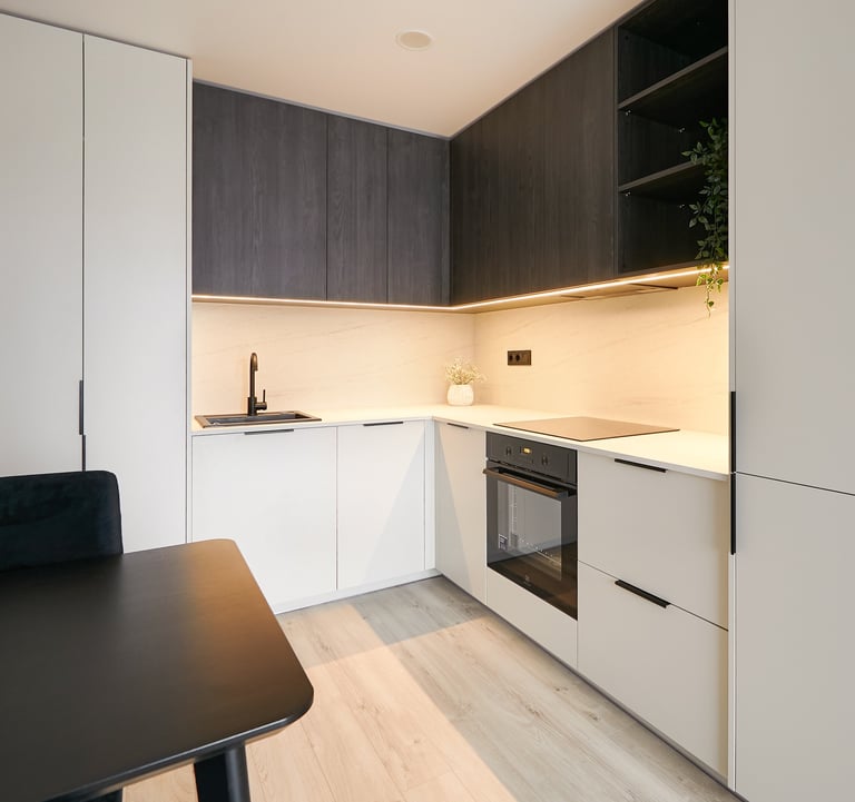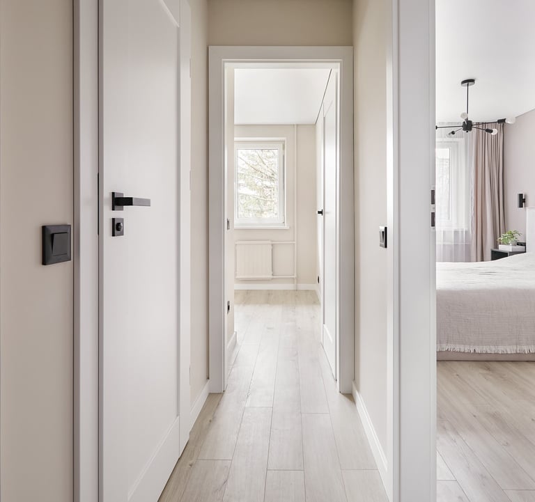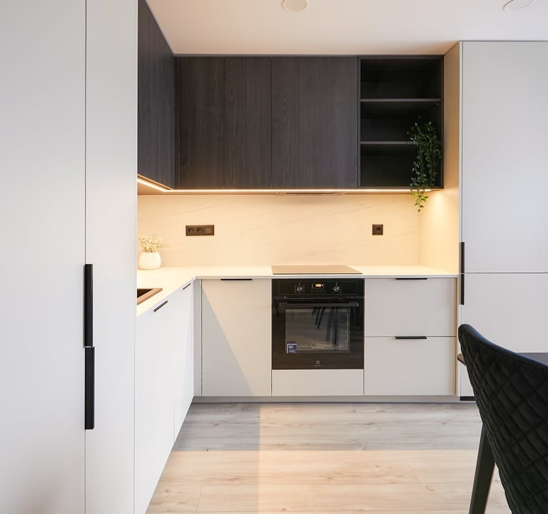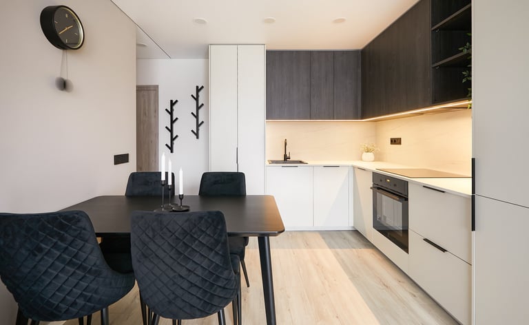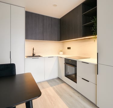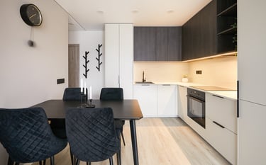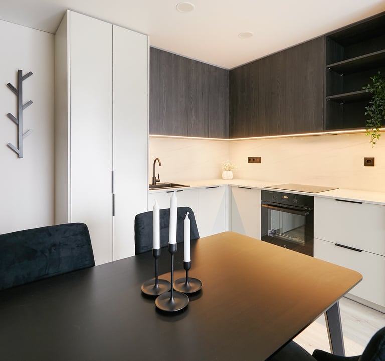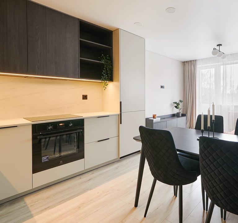 Dar vienas butas pardavimui, kuriame du kambarius perdarėme į tris. Virtuvės baldai suplanuoti svetainės zonoje - čia tilpo ir didelis valgomojo stalas, ir patogi sofa su TV vieta.