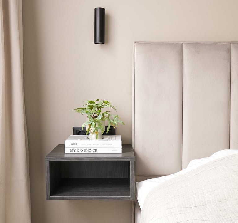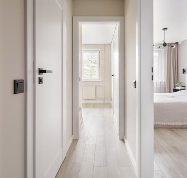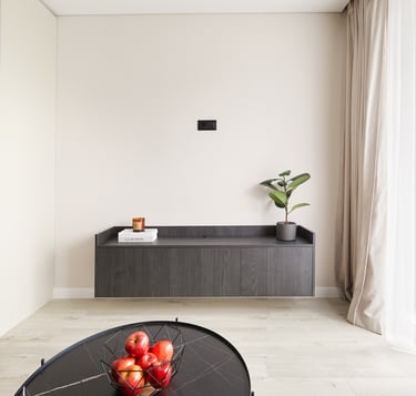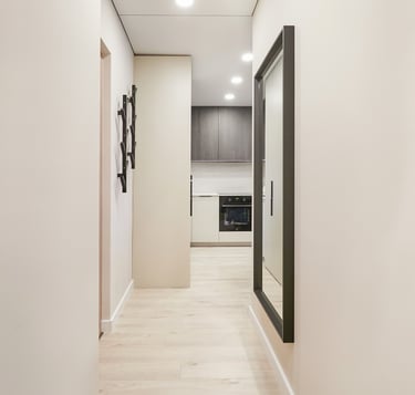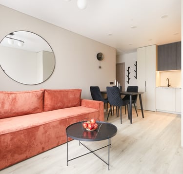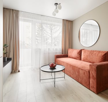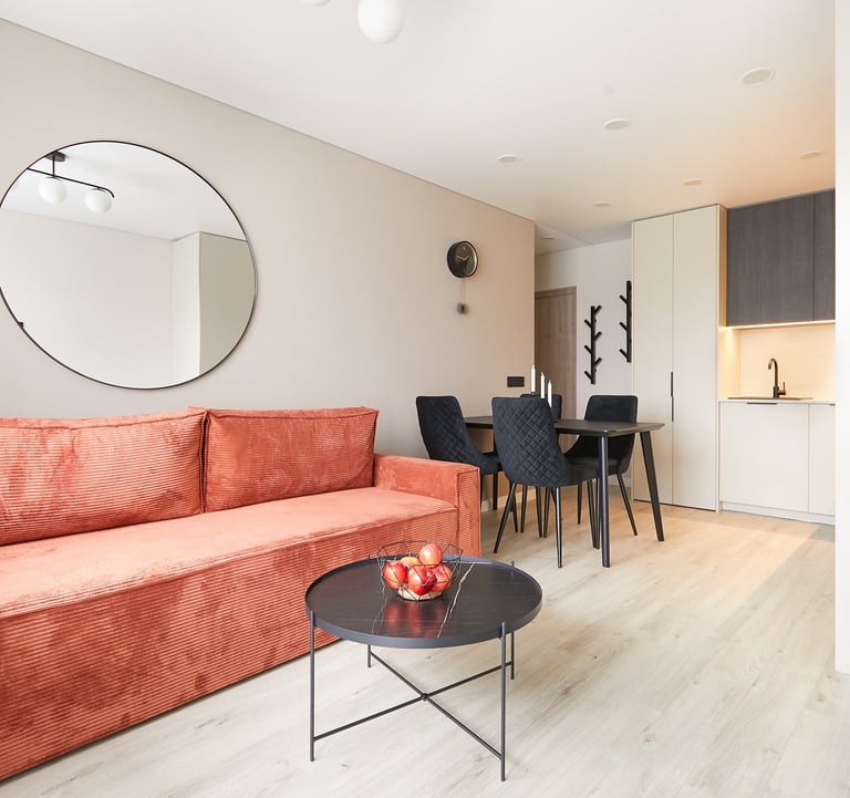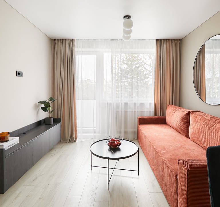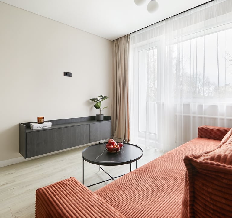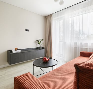 Būstas pasižymi švelniomis sienomis ir grindimis, tačiau lyg atsvara naudojami tamsūs baldai, kurie suteikia griežtesnio charakterio šiam jaukiam butui. O ryški sofa neabejotinai tapo jo akcentu.