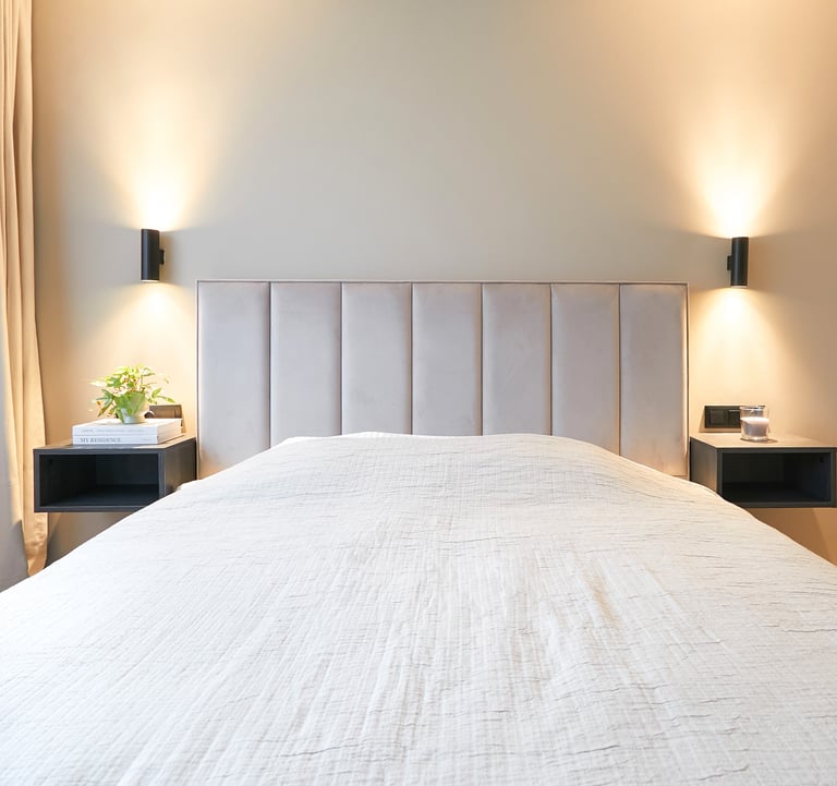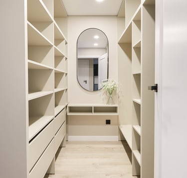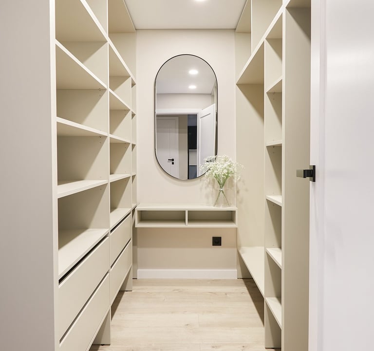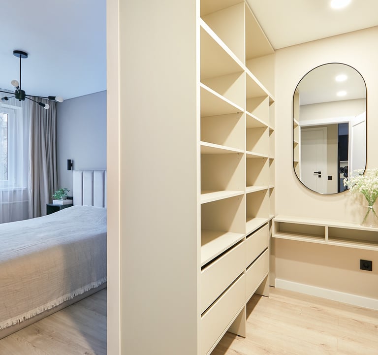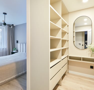 Miegamasis pasižymi apgalvotu funkcionalumu - 14-oje kvadratinių metrų tilpo ne tik dvigulė lova su naktiniais staleliais, bet ir erdvi drabužinė, kurioje suformuotas net makiažo staliukas.
