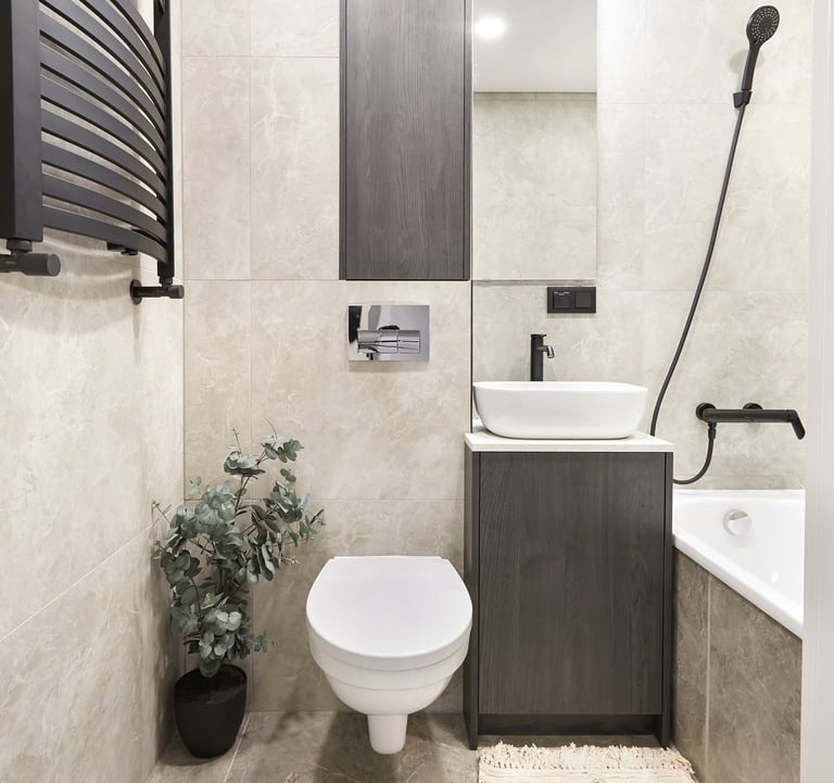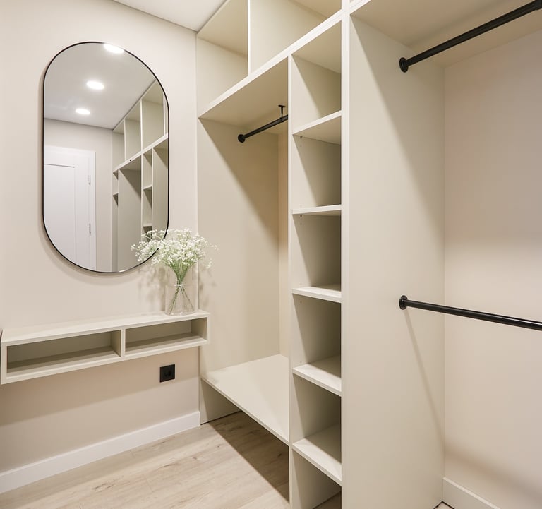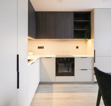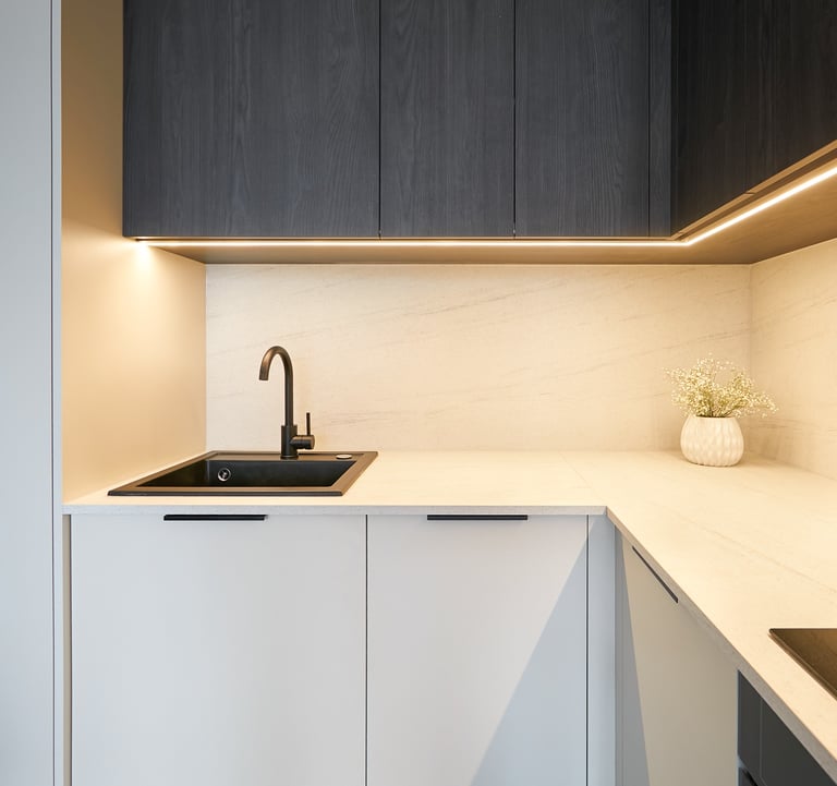 Kadangi vonios kambarys gavosi labai nedidelis, jame nebeliko vietos skalbyklei. Ji šiuo atveju buvo paslėpta virtuvės balduose, kartu su vieta viršutinių drabužių kabinimui.