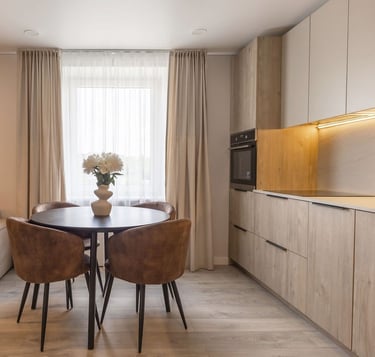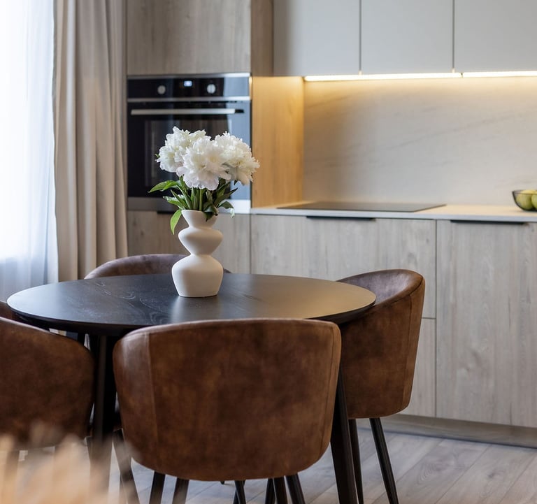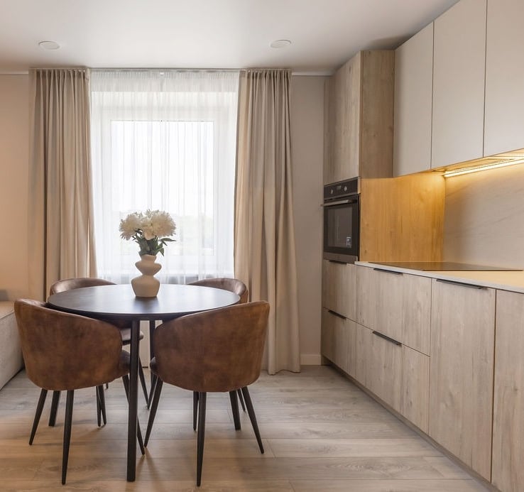 Valgomojo stalas jaukiai įsikūrė prie lango ir susiformavo jaukus kampelis svetainės zonai.