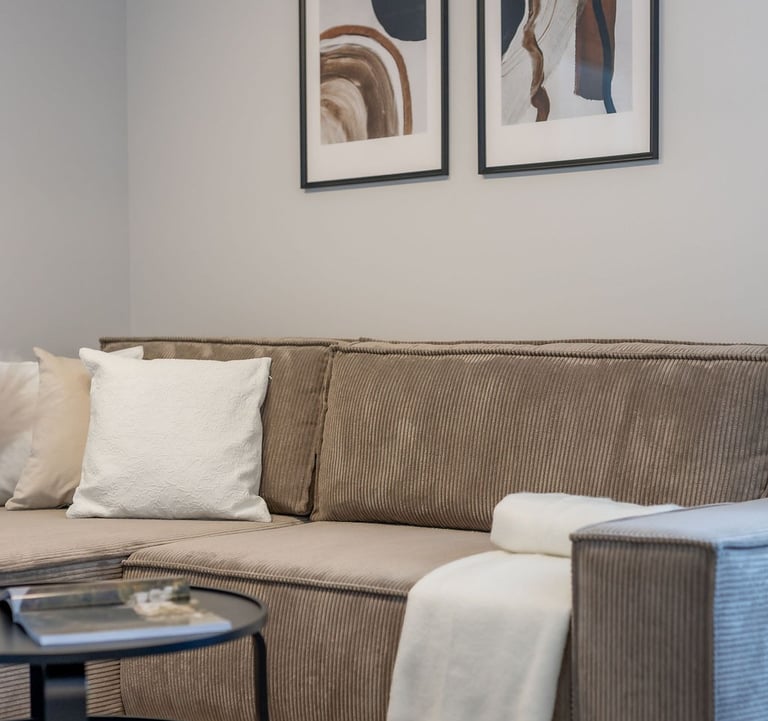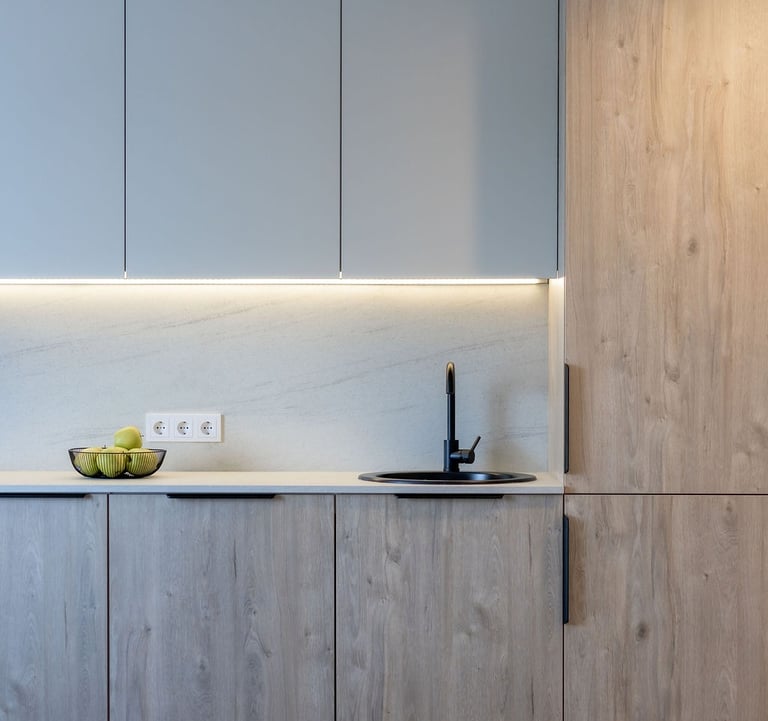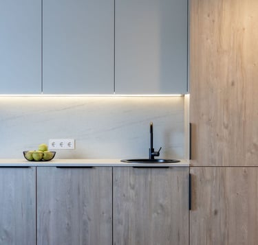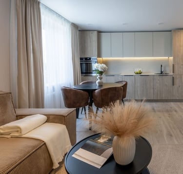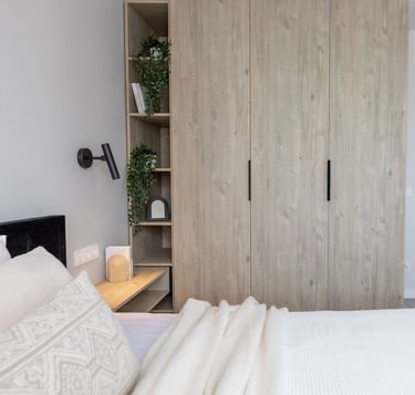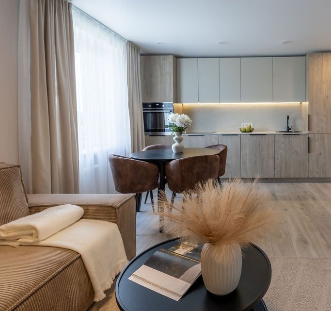 Šį butą visiškai perplanavome kitaip paskirstydami erdves. Buvo nugriauta pertvara tarp holo ir buvusio miegamojo, tuomet virtuvė perkelta į kitą buto pusę ir sujungta su holo baldais.