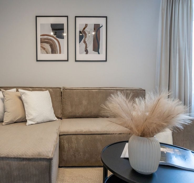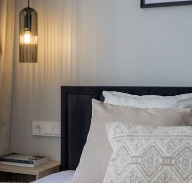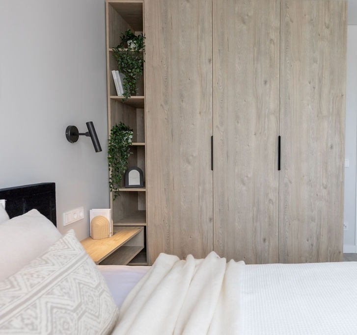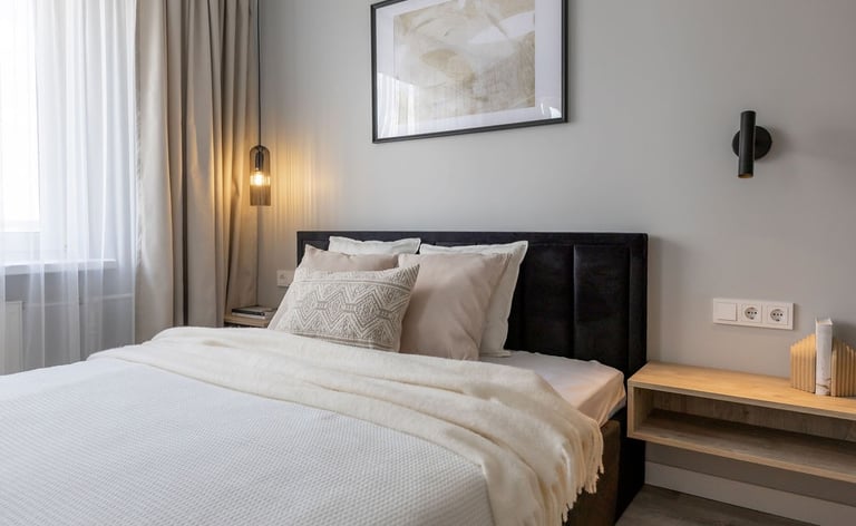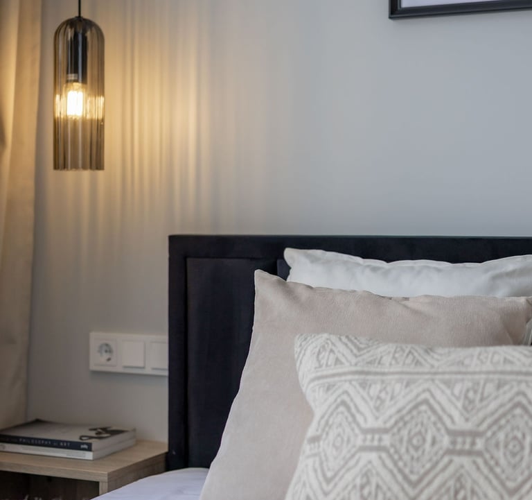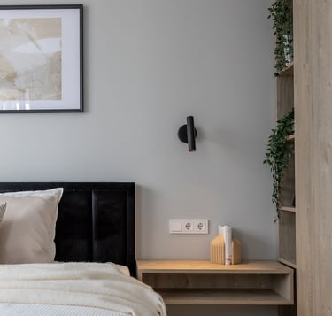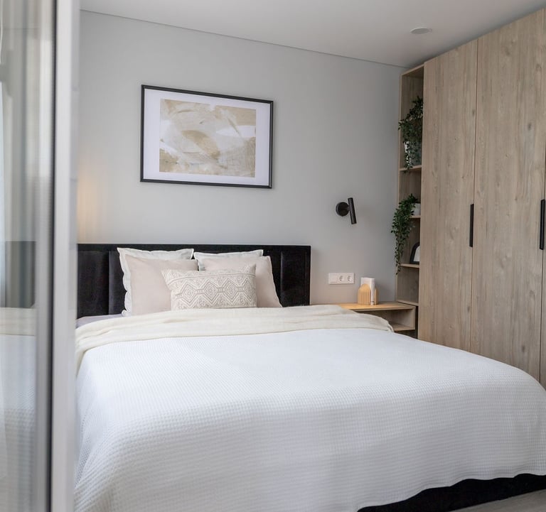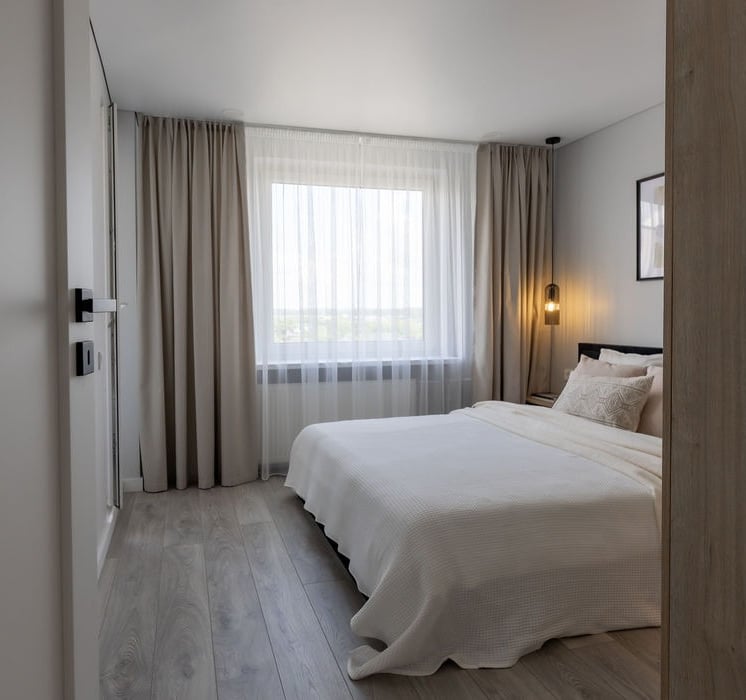 Miegamojo akcentu tapo juoda lova ir kontrastingi šviestuvai. Bute taip pat yra papildomas vaiko ar darbo kambarys, kurį paliekame tuščią.