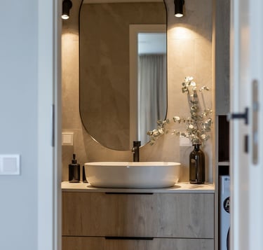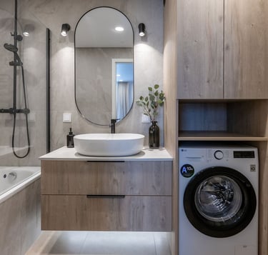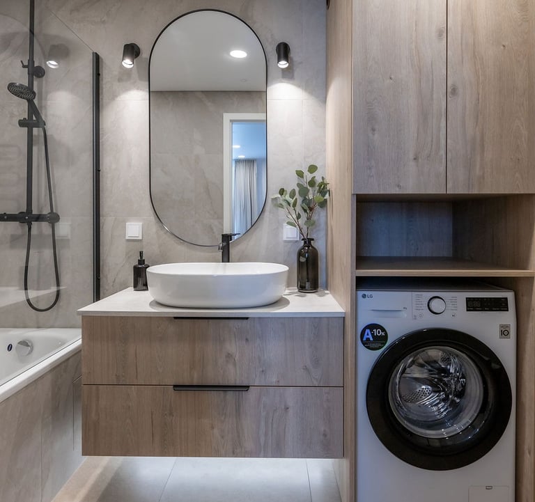 Džiaugiuosi, kad pavyko suformuluoti itin funkcionalų vonios kambarį, kuriame tilpo ir skalbyklė, ir atsirado daug sandėliavimo vietos.