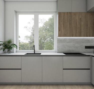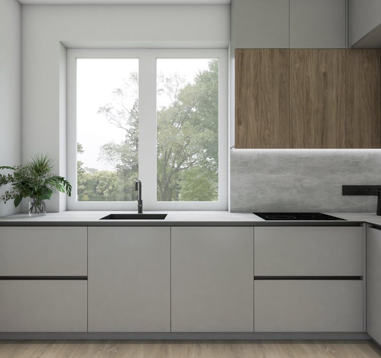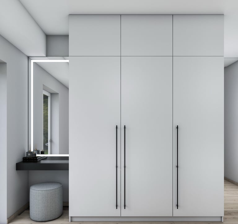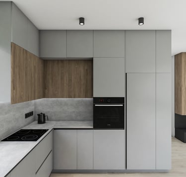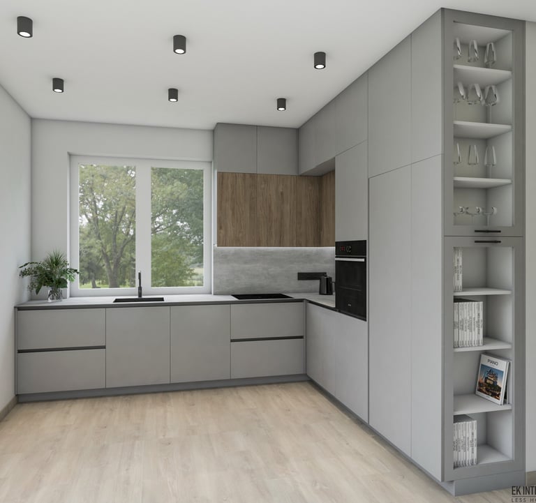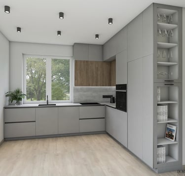 Individualiam gyvenamajam namui buvo suprojektuoti virtuvės baldai, vonios kambarys ir prieškambario bei miegamojo spinta.