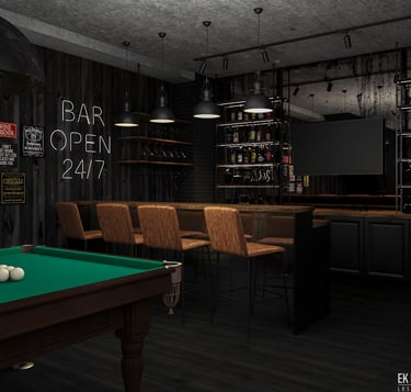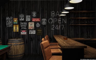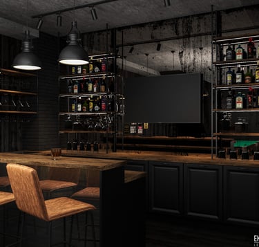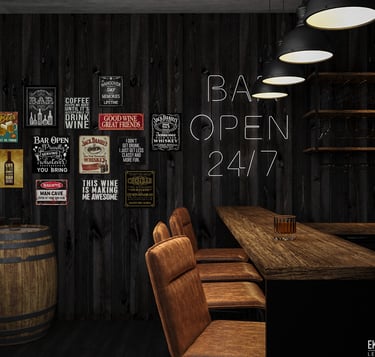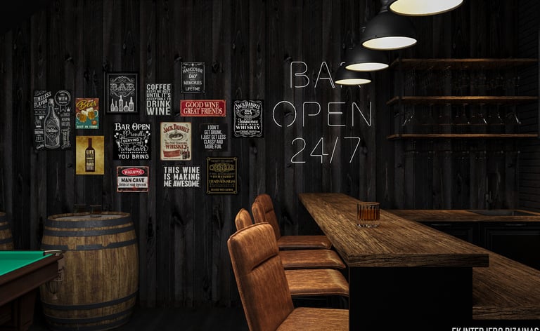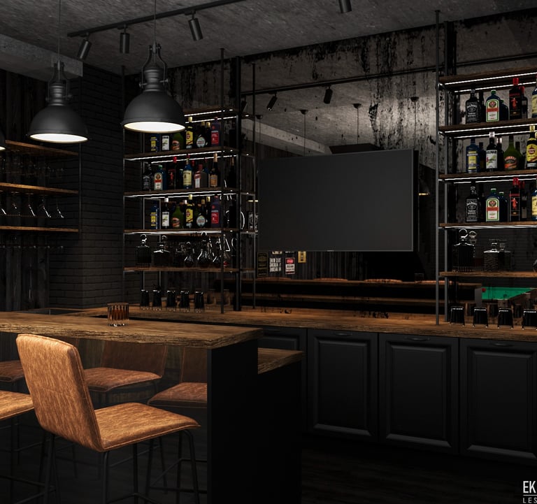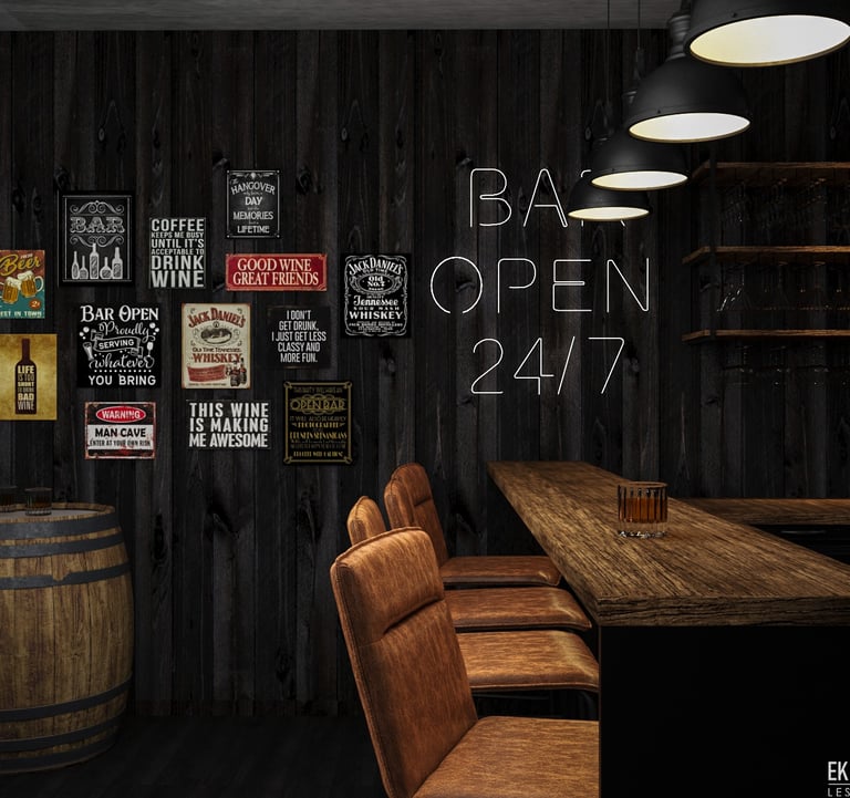 Prie šių baldų derinami industrinio stiliaus šviestuvai, sienos dekoruojamos metalinėmis iškabomis, o turimos statinės panaudotos kaip baro staliukai gėrimui pasidėti.
