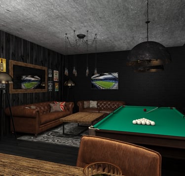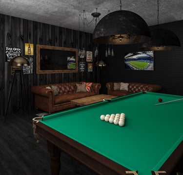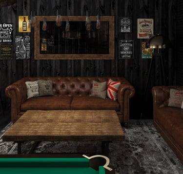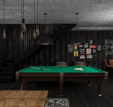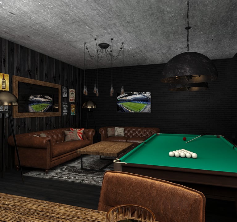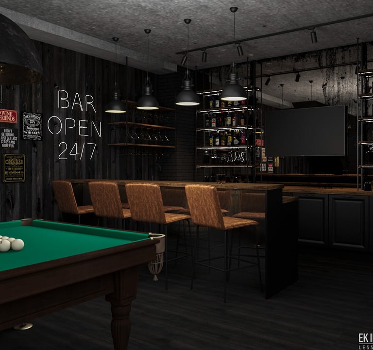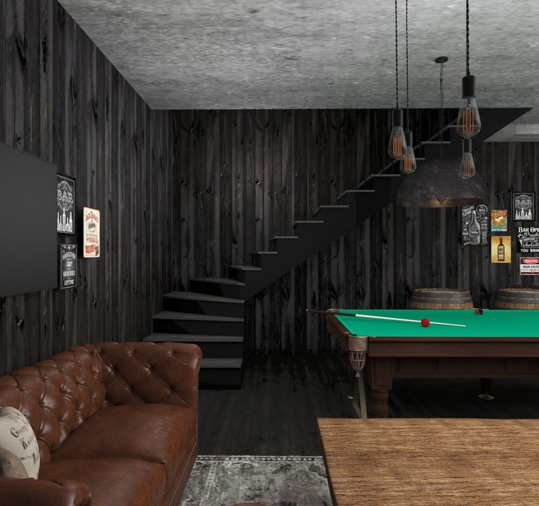 Pagrindinis rūsio akcentas - biliardo stalas, kuris tarsi yra erdvės centras. Taip pat čia suprojektuotas didelis baras su odinėmis kėdėmis bei priderinti Chesterfield stiliaus minkštieji baldai. 50 kv.m. dydžio rūsyje numatyta vieta ir vyno spintai.