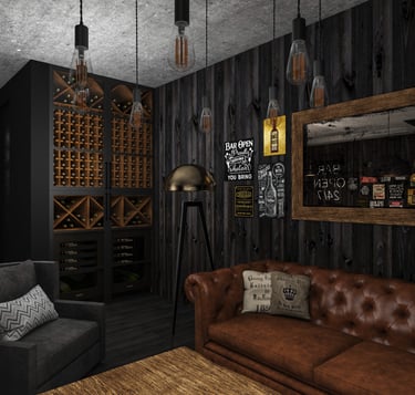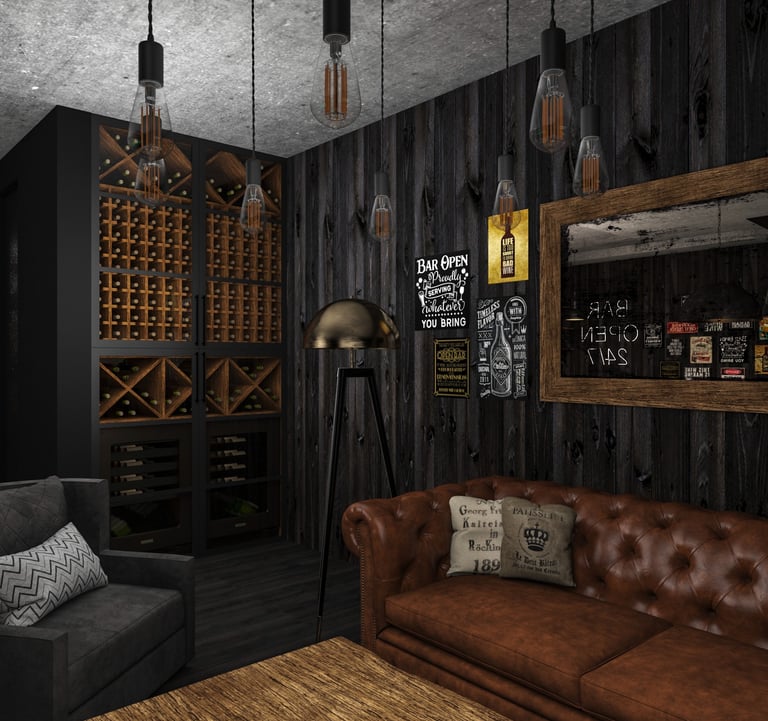 Užduotis - itin moderniame, šviesiame name suprojektuoti jam kontrastuojantį tamsų, vyrišką interjerą rūsiui.
